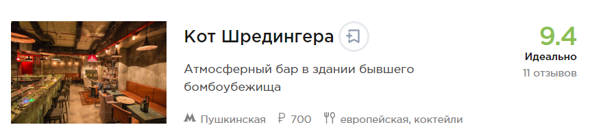 2. секретный бар в здании бывшего бомбоубежища на большой дмитровке. «кот шредингера» работает без вывески и каких-либо указателей. главные ориентир — массивная металлическая дверь со «штурвалом» во внутреннем дворе дома. нужно ее открыть, спуститься в подвал, отыскать в стене кнопку, нажать на нее и зайти в бар. главная фишка «кота шредингера» — авторские коктейли в необычной подаче. вместо классических бокалов в ход идут пробирки, коробочки для лапшы на вынос и посуда в форме лампочек, гранаты с чекой, робота или канистры для топлива.