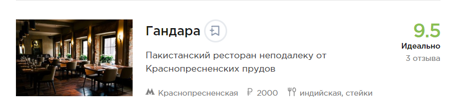 1. пакистанский ресторан неподалеку от краснопресненских прудов. свое название заведение получило по имени древнего царства, располагавшегося ранее на северо-западе пакистана. дизайнер ариф ашри декорировал пространство ресторана копиями гандарских скульптур и украсил барную стойку копиями рельефов, хранящихся в музеях мира. в меню «гандары» — индийские и пакистанские блюда, большую часть из них готовят на гриле, включая кебабы. в глиняном тандуре выпекают традиционные лепешки. периодически в ресторане проходят светские вечеринки.