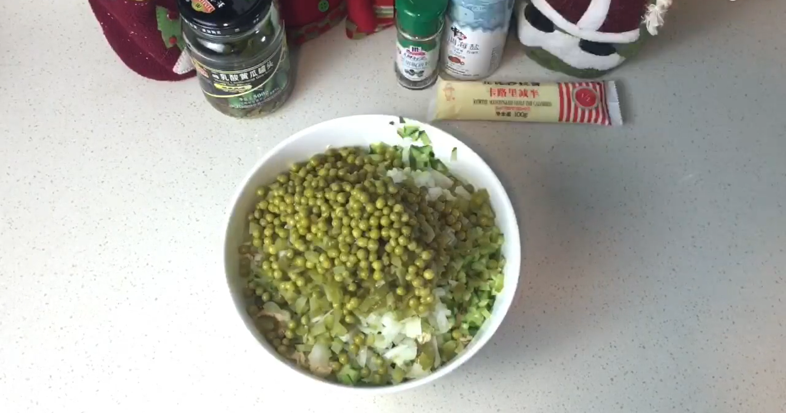 加入豌豆,加入适量盐搅拌均匀。加入蛋黄酱。