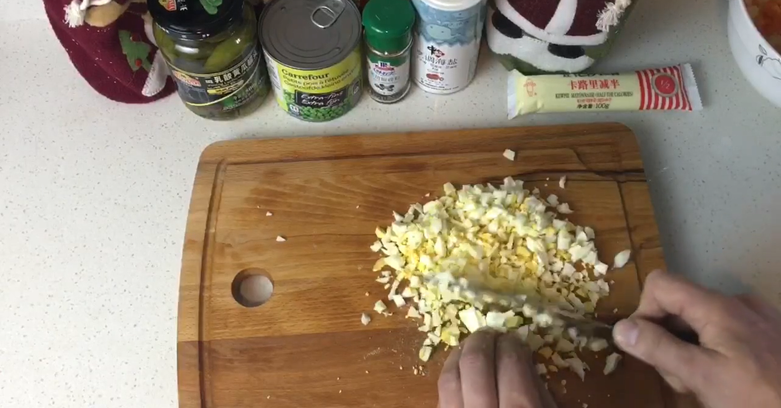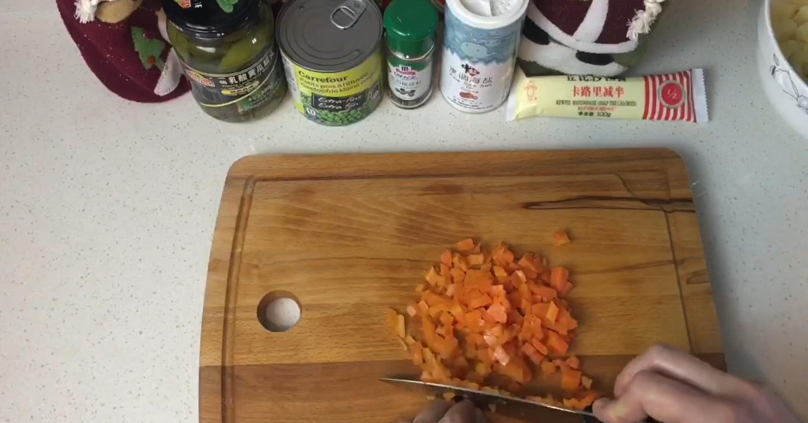 首先准备好所有必要食材。将鸡蛋煮熟(10分钟)。水中加盐,放入土豆胡萝卜煮熟。将豌豆罐头中的水滤去不要。