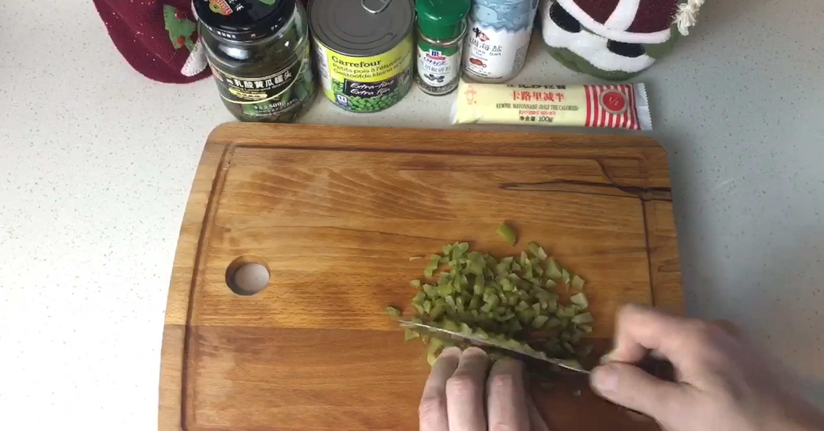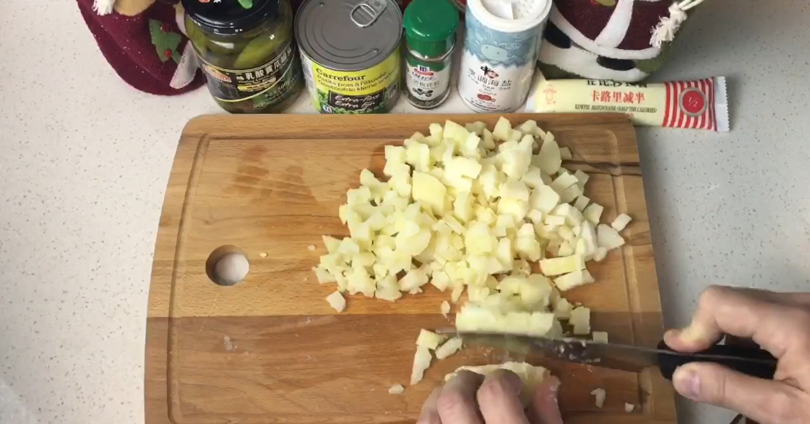 将腌黄瓜也切成同样大小的小丁,装盘前挤出多余汁水,防止成品水分过多。香肠及其他配料均切成丁。