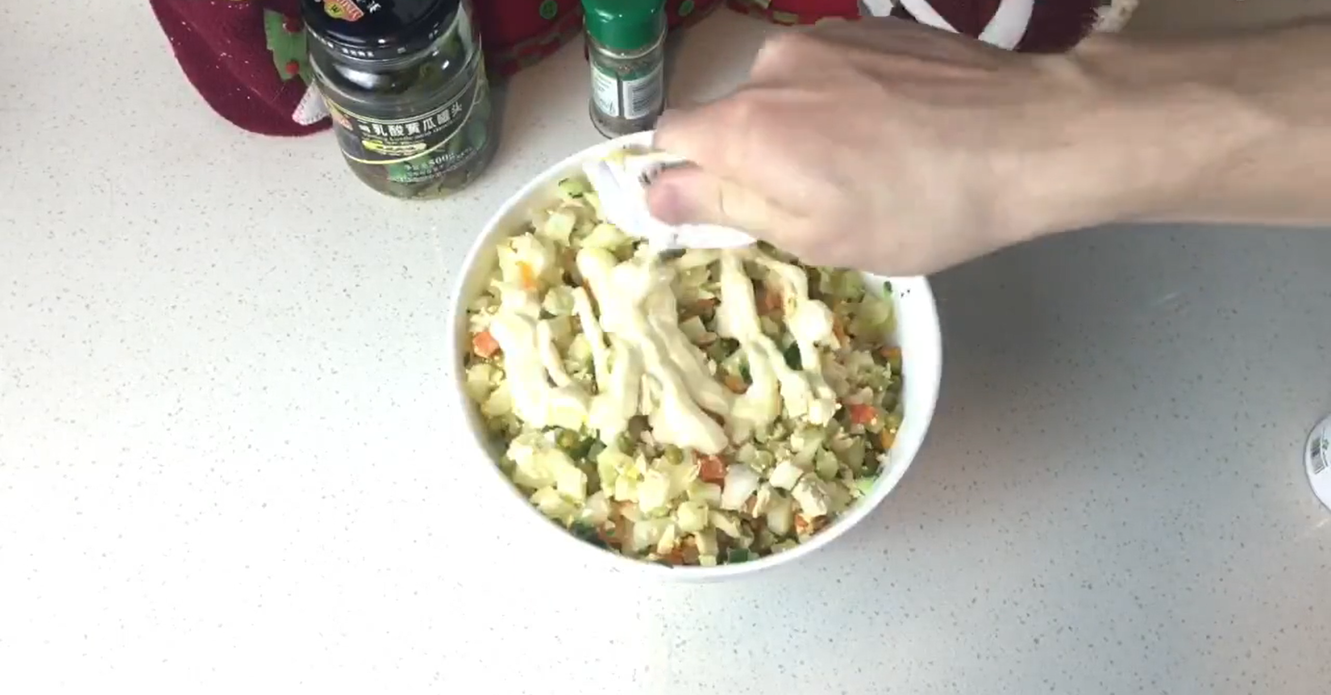 充分搅拌,让每一块食材都裹上蛋黄酱。